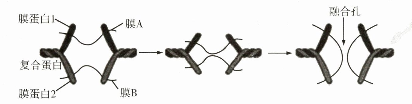 12. (角度创新)生物体内绝大多数膜融合都需要蛋白质的介导,即膜上的两组蛋白质相互结合成螺旋状的复合蛋白,使磷脂分子失去稳定性,进而重排形成融合孔,最终实现膜的融合,过程如图所示。下列相关叙述错误的是( )