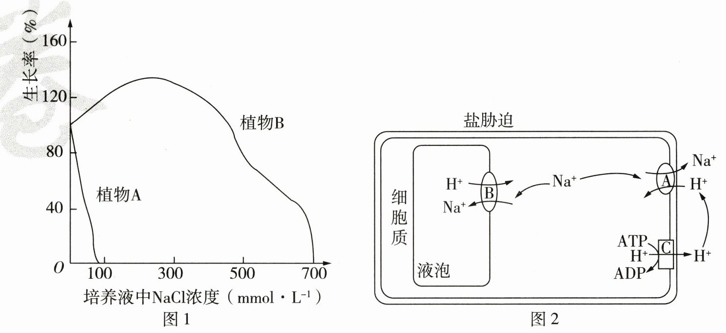 (1)B(1分) 与植物A相比,植物B更耐盐 (2)协助扩散 (3)①膜两侧H⁺浓度差形成的势能 通过主动运输来选择吸收所需要的物质,排出代谢废物和对细胞有害的物质,从而保证细胞和个体生命活动的需要 ②使Na⁺进入液泡、使Na⁺排出细胞