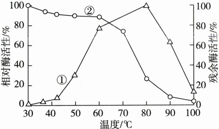 19.(生产情境)[2024山东省实验中学高一月考]固定化酶是指在一定的空间范围内起催化作用,并能反复和连续使用的酶。固定化酶用于生产前,需要获得被固定化的酶的有关数据。图中曲线①表示相对酶活性,即某种酶在各种温度下酶活性相对最高酶活性的百分比,曲线②表示残余酶活性,即该种酶在不同温度下保温足够长时间后,再在酶活性最高的温度下测得的酶活性。下列分析错误的是 ( )