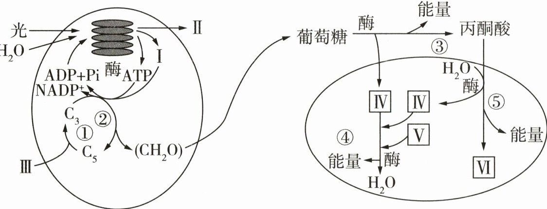 12. (回归教材)[2024石家庄二中高一期末]光合作用与细胞呼吸相互依存、密不可分,又具有相对独立性。如图是某植物光合作用和细胞呼吸过程的示意图,其中Ⅰ ~ Ⅵ表示物质,① ~ ⑤表示过程。下列叙述正确的是 ( )