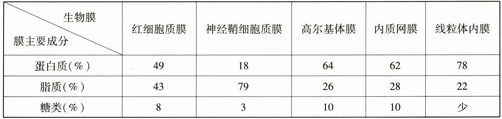 17. [2023海南卷]不同细胞的几种生物膜主要成分的相对含量见表。