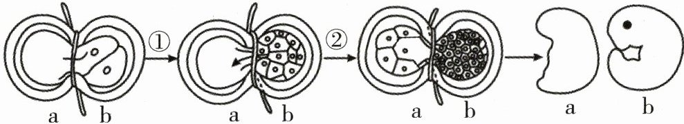 19. [2024安徽师大附中高一月考]科学家通过下列实验(如图)探究细胞核的功能:①用头发将蝾螈的受精卵横缢为有核和无核的两半,中间只有很少的细胞质相连,结果无核的一半a停止分裂,有核的一半b能继续分裂;②b部分分裂到16 ~ 32个细胞时,将一个细胞核挤到不能分裂的a部分,结果a部分开始分裂,最后发育成胚胎。下列叙述中错误的是 ( )