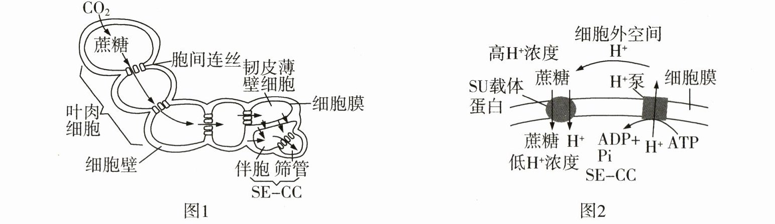 16. [2024吉安一中高一期末]高等植物体内的光合产物会以蔗糖的形式从叶肉细胞移动到邻近的小叶脉,进入其中的筛管 - 伴胞复合体(SE - CC),再逐步汇入主叶脉运输到植物体的其他部位。图1为蔗糖进入SE - CC的途径之一,蔗糖从细胞外空间进入SE - CC的过程如图2所示。下列说法错误的是 ( )