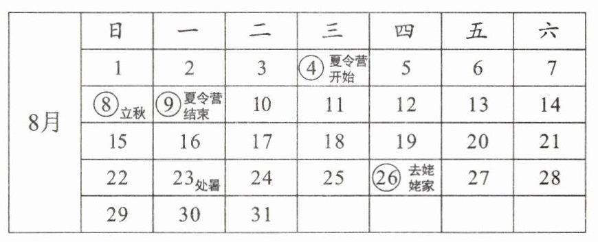 3. “二十四节气”中的立秋是( )月( )日,星期( );处暑是( )月( )日,星期( )。
