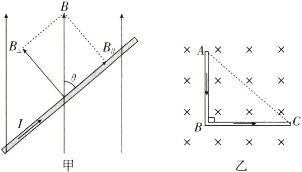 活动2:实验发现,当磁感应强度B的方向与通电导线的方向平行时,导线受力为0。那么图甲中长为l的一段导线所受安培力是多大?方向如何?