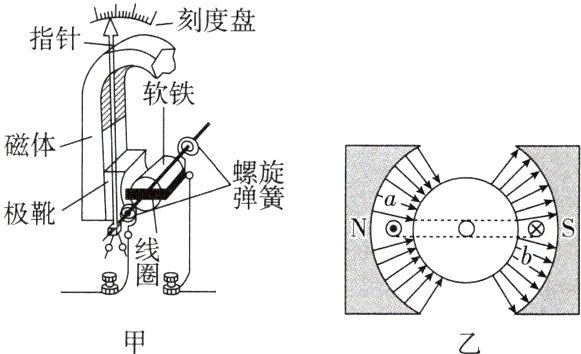 [规范解答] 由于磁场辐向分布,且线圈与铁芯共轴,故线圈平面总是与磁感线平行,A正确。通有电流时,线圈在安培力的作用下转动,从而使螺旋弹簧发生形变,螺旋弹簧因为形变而产生阻碍线圈转动的力,故B正确。当线圈在如图乙所示的位置时,由左手定则知,b端受到的安培力方向向下,故C错误。电流变化相同时,安培力变化相同,螺旋弹簧的弹力变化相同,螺旋弹簧较“硬”时,形变量的变化较小,灵敏度较小,故D错误。[答案] AB