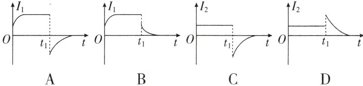C [L的直流电阻不计,可知电路稳定后通过$L_{1}$的电流是通过$L_{2}$、$L_{3}$电流的2倍。闭合开关瞬间,$L_{2}$立即变亮,由于L的阻碍作用,$L_{1}$逐渐变亮,即$I_{1}$逐渐变大,在$t_{1}$时刻断开开关S,之后电流I会在电路稳定时通过$L_{1}$的电流大小基础上逐渐变小,$I_{1}$方向不变,$I_{2}$反向,故C正确,A、B、D错误。]