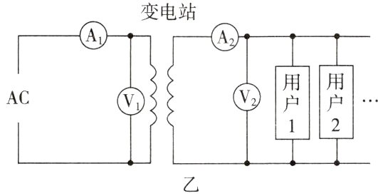 活动3:如图乙,家庭电路都是接在变电站的副线圈两端,家庭电路的电压一般可认为不变,傍晚工作的用电器增多时,两个电流表的示数如何变化?