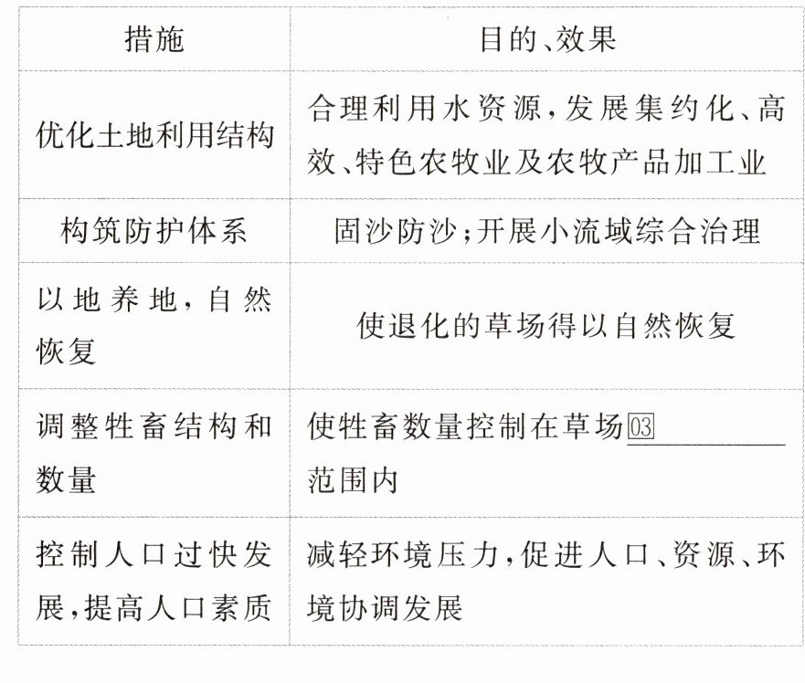 (2)综合运用02______、工程、经济、社会等措施解决问题,实现人地和谐发展。