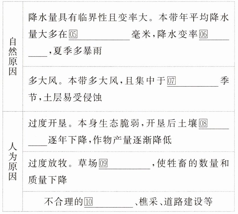 提示 水土流失。降水集中,夏季多暴雨;地形起伏大;土质疏松;植被覆盖率低等。
