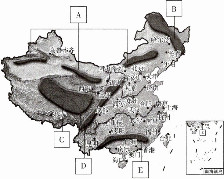 A为北方防沙带,B为东北森林带,C为青藏高原生态屏障,D为黄土高原—川滇生态屏障,E为南方丘陵山地带。