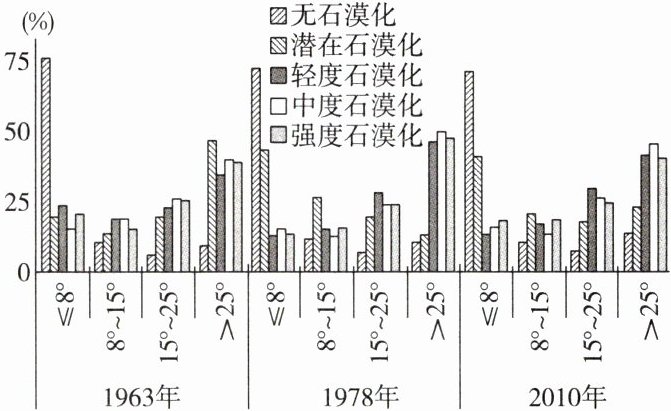 后寨河地区位于贵州省普定县,位于长江流域和珠江流域的分水岭地区。下图示意不同年份该地区不同坡度的石漠化土地分布。据此完成(1)~(2)题。