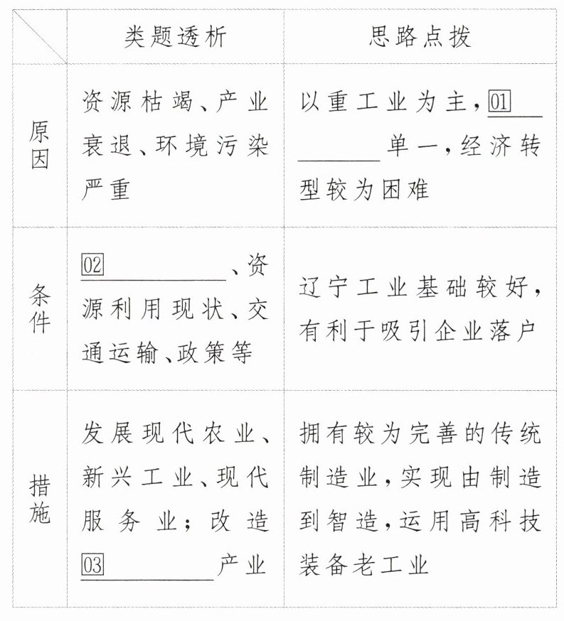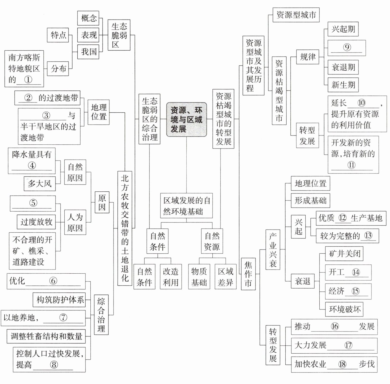 ①石漠化 ②农区与牧区 ③半湿润地区 ④临界性且变率大 ⑤过度开垦 ⑥土地利用结构 ⑦自然恢复 ⑧人口素质 ⑨繁荣期 ⑩产业链 ⑪主导产业 ⑫无烟煤 ⑬工业体系 ⑭不足 ⑮衰退 ⑯工业多元化 ⑰旅游业 ⑱产业化