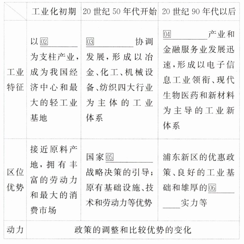 经济增长方式的转变:在工业内部,由以 04______ 为主上升到以重化工业为主;由以原材料为主上升到以加工组装为主;由以 05______值 的劳动密集型产业为主上升到以高附加值的 06______ 密集型产业为主。