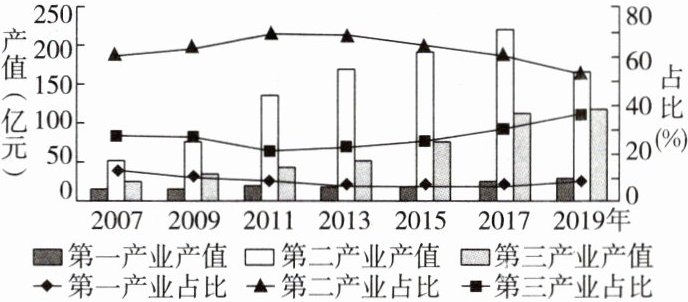 湖南省资兴市曾是有名的“煤都”,2008年被列为国家第二批资源枯竭型城市。近年来,资兴市关停淘汰高耗能、高污染企业,鼓励能源、有色金属等优势企业技术改造,目前有色金属固废循环利用、微晶石墨等技术标准领跑全国。同时,资兴市发挥东江湖独特的生态优势,大力发展生态食品特色产业,依托美丽的东江湖和现代农业,全面实施“旅游+”和“+旅游”工程。实现“黑色经济”向“绿色经济”转变。下图为资兴市2007—2019年三大产业产值及所占比例统计图。