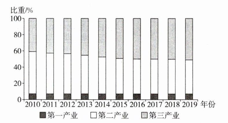 下图为江苏省2010—2019年三次产业结构变化图。读图,完成(1)~(2)题。