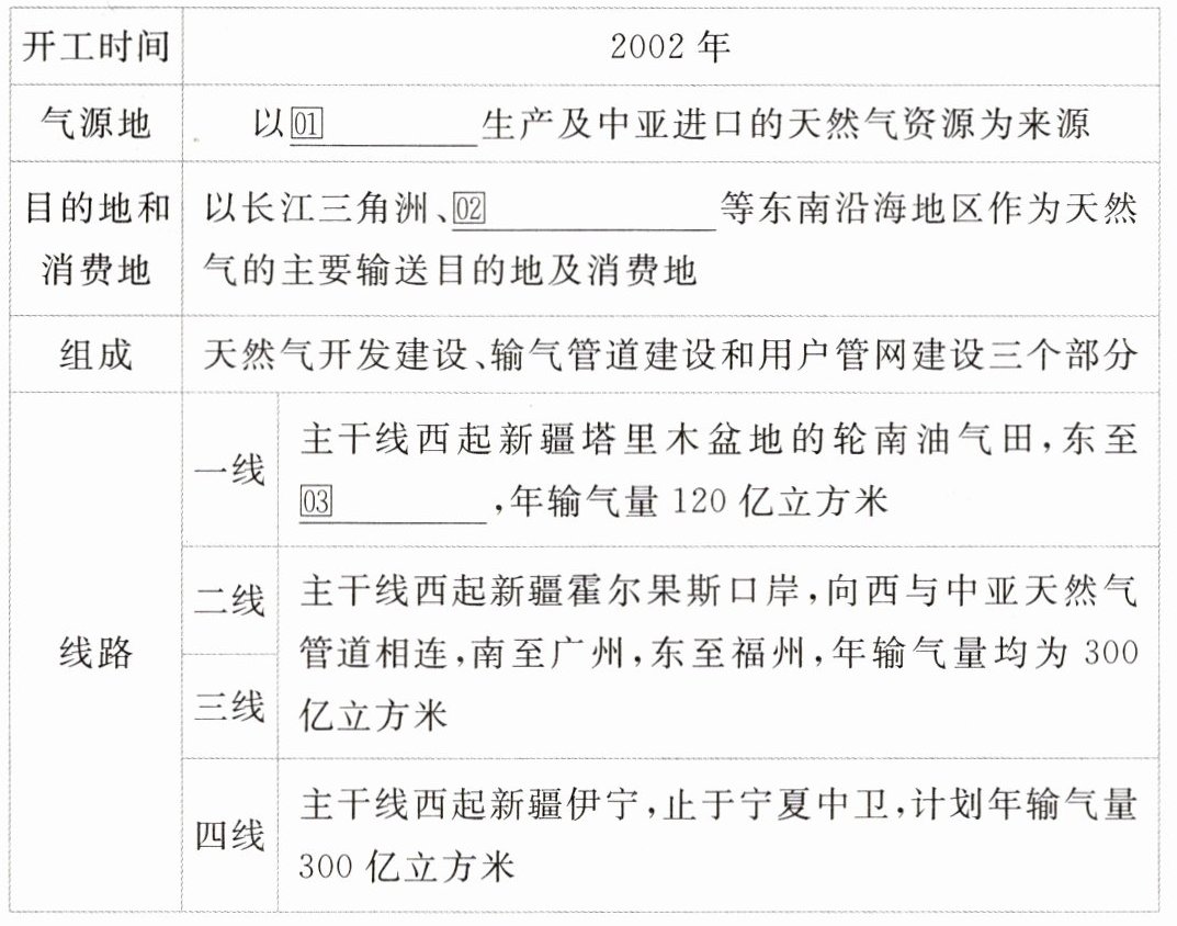 ②四大气区:新疆、青海、川渝、鄂尔多斯;③油气发展战略:稳定东部,发展西部;④在“一带一路”建设中, 09____是油气进口的重要通道。
