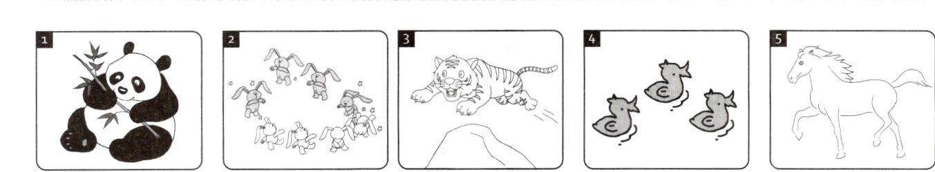 Taking photos is my hobby. I often take photos at the weekend, So I have got many beautiful photos. Look at these photos. In this photo, eight rabbits are playing. In this photo, a panda is eating bamboo. In this photo, a horse is running. In this photo, a tiger is jumping. And just look at this! The ducks are swimming in the pond; They are so cute. Are these photos nice?