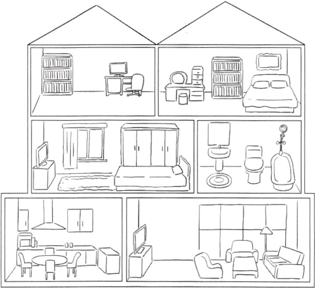 It's six o'clock in the evening. The Greens are at home. Mrs Green is in the kitchen. She's cooking. Mr Green is in the living room. He's reading newspapers. Paul is in the study. He's reading a storybook. What about his brother Peter? He's in the bedroom. He's sleeping.