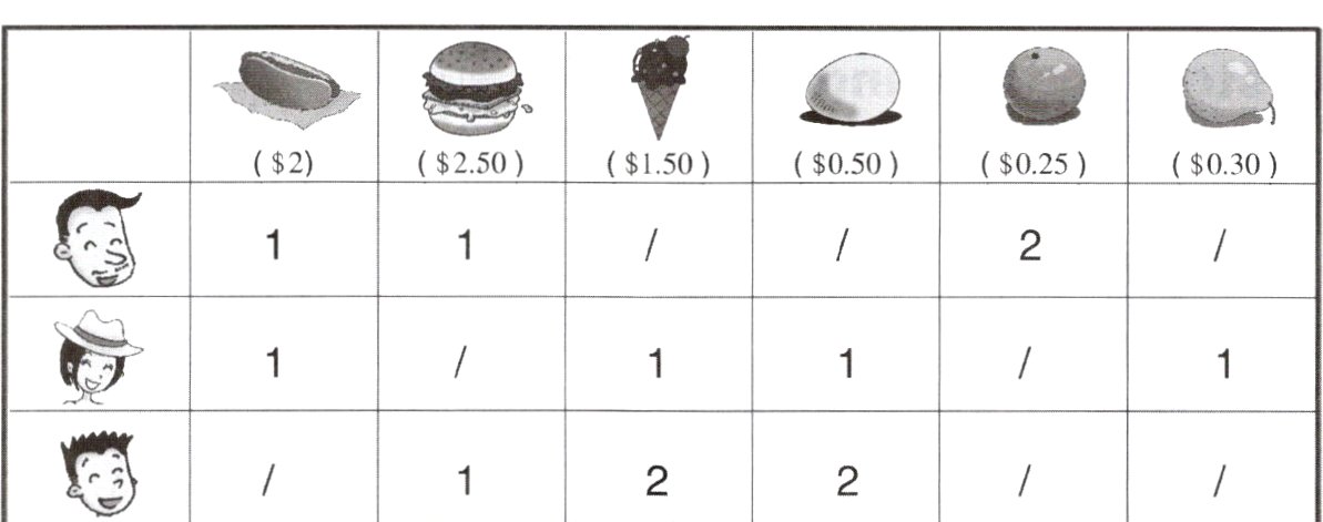 1)Simon's father wants a hot dog, a hamburger and two oranges.
