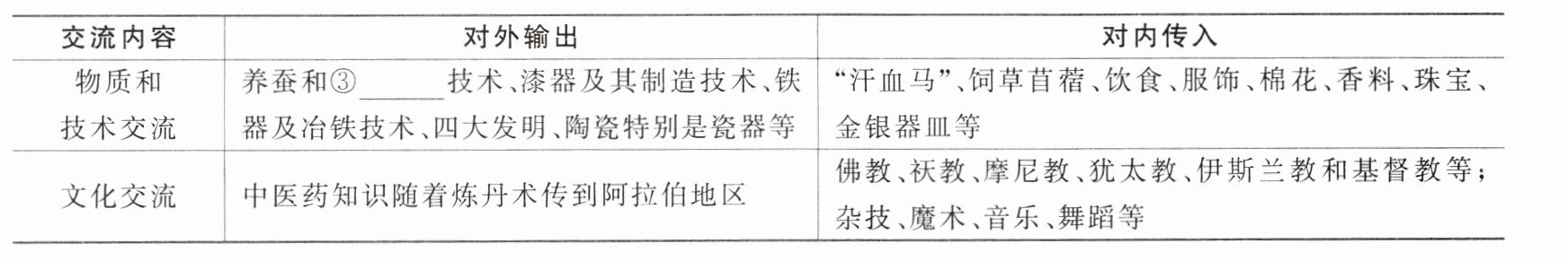 文化交流 中医药知识随着炼丹术传到阿拉伯地区 佛教、祆教、摩尼教、犹太教、伊斯兰教和基督教等;杂技、魔术、音乐、舞蹈等