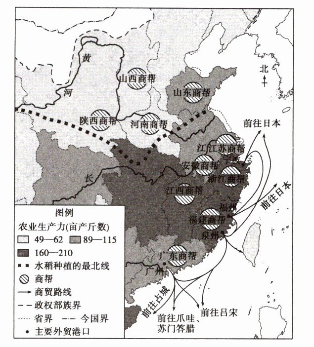 解析 由图中可以看出,长江中下游的浙江、江西、湖北等地的农业生产力是最高的一档,江苏、安徽等地也较高,因此长江中下游农业生产水平总体较高,②正确;拥有主要外贸港口的省份,如浙江、福建、广东都有商帮,④正确。故选B项。商帮在北方的山西、陕西等省也有分布,①排除;示意图并不能说明海禁阻断海外贸易,反之,仍有通往日本、越南、菲律宾等国的商贸路线,③排除。