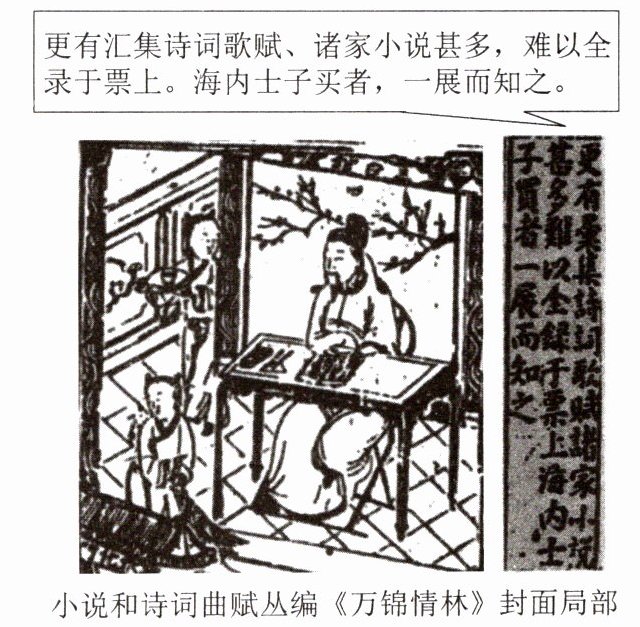 解析 题干强调此种封面形式常见于明代刻本书籍,图中文字主要是对《万锦情林》的介绍,且带有广告效应,意在宣传书籍,吸引读者购买。结合明代商品经济发展的史实分析可知,该图可以佐证明代文化产品商品化程度加深,C项正确。唐代已出现雕版印刷品,A项中“开始”说法错误,排除;元杂剧标志着中国古代戏曲艺术的成熟,B项排除;明代士人思想尚未摆脱专制束缚,D项排除。