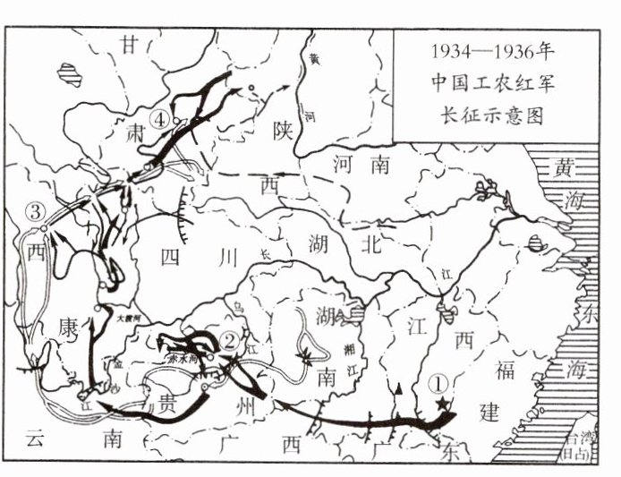 解析 据关键信息“长征途中”“开始确立了以毛泽东同志为主要代表的马克思主义正确路线在党中央的领导地位”并联系所学可知,此次会议为遵义会议。遵义与图中的②位置相符,故选B。