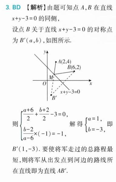 3. (多选)[江西抚州一中2024高二月考]2023年动画电影《长安三万里》重新点燃了人们对唐诗的热情,唐诗中边塞诗又称出塞诗,是唐代汉族诗歌的主要题材,是唐诗当中思想性最深刻、想象力最丰富、艺术性最强的一部分,唐代诗人李颀的边塞诗《古从军行》开头两句说:“白日登山望烽火,黄昏饮马傍交河”. 诗中隐含着一个有趣的数学问题——“将军饮马”,即将军在白天观望烽火台,黄昏时从山脚下某处出发,先到河边饮马,再回军营,怎样走才能使总路程最短?在平面直角坐标系中,设将军的出发点是$A(2,4)$,军营所在位置为$B(6,2)$,河岸线所在直线的方程为$x + y - 3 = 0$,若将军从出发点到河边饮马,再回到军营的总路程最短,则( )
