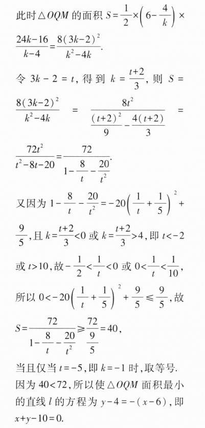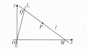 【思路导引】根据题意,画出平面直角坐标系及点的位置,根据直线l过点P设出直线l的方程,分别求出点Q,M的坐标,从而用代数式表示出△OQM的面积,进而可求出最小值. 注意分直线斜率存在和不存在两种情况讨论.