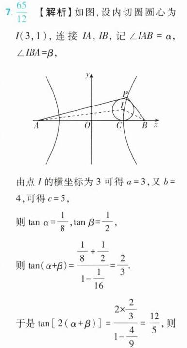 7. [2023全国高中数学联赛重庆预赛]双曲线$\frac{x^{2}}{a^{2}}-\frac{y^{2}}{16}=1$的左、右焦点分别为$A,B$,$P$是双曲线上一点.若$\triangle PAB$的内切圆圆心为$(3,1)$,则$\triangle PAB$外接圆的半径为 .