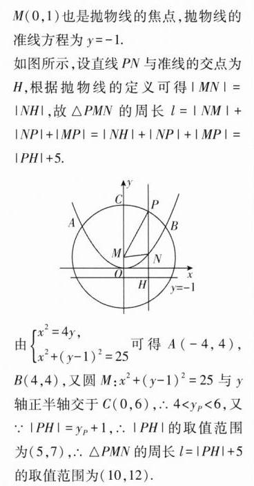 7. [山东济南历城第二中学2023高二期中]抛物线$E:x^{2}=4y$与圆$M:x^{2}+(y - 1)^{2}=25$交于$A,B$两点,圆心$M(0,1)$,点$P$为劣弧$AB$上不同于$A,B$的一个动点,平行于$y$轴的直线$PN$交抛物线于点$N$,则$\triangle PMN$周长的取值范围是________.