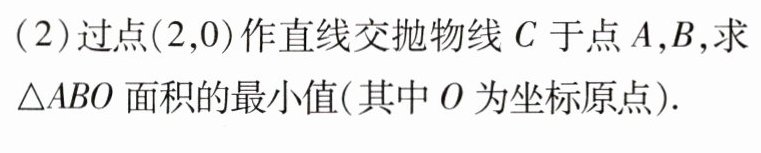 (2)过点$(2,0)$作直线交抛物线$C$于点$A$,$B$,求$\triangle ABO$面积的最小值(其中$O$为坐标原点).