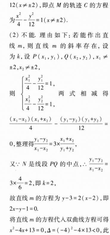 (2)过点$N(2,3)$能否作一条直线$m$与轨迹$C$交于两点$P$,$Q$,且点$N$是线段$PQ$的中点?若能,求出直线$m$的方程;若不能,说明理由.