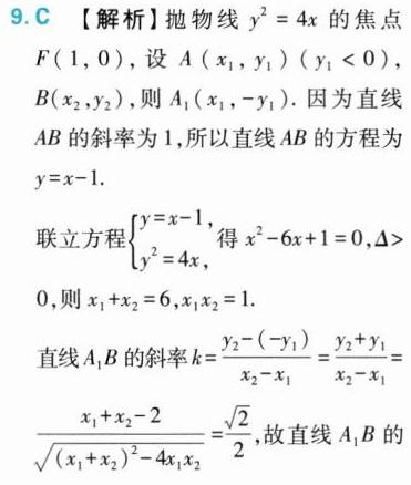 9. 已知抛物线$y^{2}=4x$,过焦点$F$作直线与抛物线交于点$A$,$B$(点$A$在$x$轴下方),点$A_1$与点$A$关于$x$轴对称. 若直线$AB$的斜率为1,则直线$A_1B$的斜率为 ( )