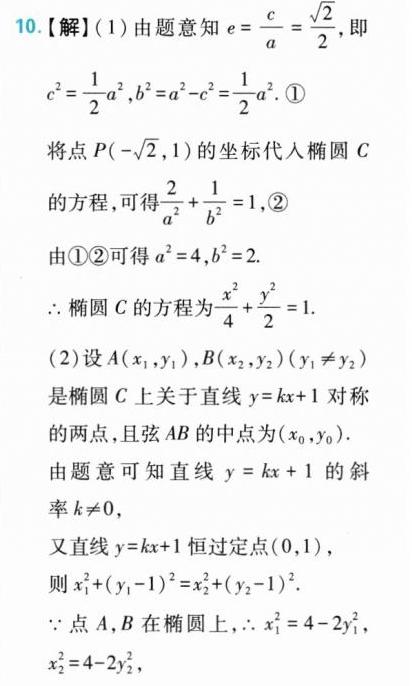 10. 已知椭圆$C$:$\frac{x^{2}}{a^{2}}+\frac{y^{2}}{b^{2}}=1(a>b>0)$的离心率$e = \frac{\sqrt{2}}{2}$,点$P(-\sqrt{2},1)$在该椭圆上.