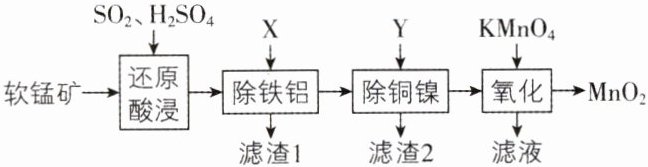 【思路导引】二氧化锰具有氧化性,$SO_2$具有还原性,“还原酸浸”步骤二者发生氧化还原反应,离子方程式为$MnO_2 + SO_2 = Mn^{2+} + SO_4^{2 - }$,酸性条件下,$MnO_2$将铁氧化为$Fe^{3+}$,“除铁铝”步骤加入X调节溶液的pH,促进$Fe^{3+}$、$Al^{3+}$生成氢氧化物沉淀,从而除去铁、铝;“除铜镍”步骤加入Y,以沉淀的形式除去$Cu^{2+}$、$Ni^{2+}$,“氧化”步骤加入$KMnO_4$将$Mn^{2+}$氧化为$MnO_2$,过滤,得到$MnO_2$,据此分析解答。