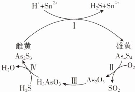 【解析】反应Ⅰ中$Sn$元素化合价升高,$Sn^{4+}$为氧化产物,A正确;反应Ⅰ的离子方程式为$2As_2S_3 + 2Sn^{2+} + 4H^+ = As_4S_4 + 2Sn^{4+} + 2H_2S↑$,$As_2S_3$与$Sn^{2+}$恰好完全反应时,物质的量之比为1:1,B错误;反应Ⅱ中发生反应$As_4S_4 + 7O_2 = 2As_2O_3 + 4SO_2$,每转移28 mol电子,生成4 mol $SO_2$,所以转移0.7 mol电子时,生成0.1 mol $SO_2$,C正确;反应Ⅲ和Ⅳ中各元素化合价都没有变化,均属于非氧化还原反应,D正确。