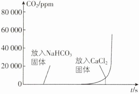 [解析]分析CO2的浓度变化曲线,体系中只有水时,CO2浓度为0,当加入NaHCO3固体后,CO2浓度逐渐增大,但增大的较为缓慢,说明NaHCO3溶液会缓慢地分解产生CO2,再加入CaCl2固体后,CO2浓度快速增大,说明反应产生大量的CO2,即NaHCO3 与CaCl2反应产生了CO2,反应的离子方程式为2HCO+Ca²+