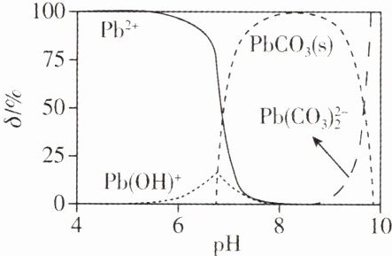 4. [湖北 2024·13,3 分]$CO_{2}$气氛下,$Pb(ClO_{4})_{2}$溶液中含铅物种的分布如图。纵坐标($\delta$)为组分中铅占总铅的质量分数。已知$c_{0}(Pb^{2 + })=2.0\times10^{-5}\ mol\cdot L^{-1}$,$pK_{a1}(H_{2}CO_{3}) = 6.4$、$pK_{a2}(H_{2}CO_{3}) = 10.3$,$pK_{sp}(PbCO_{3}) = 12.1$。下列说法错误的是( )