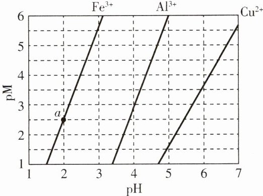 1. [全国甲 2023·13,6 分]如图为$Fe(OH)_{3}$、$Al(OH)_{3}$和$Cu(OH)_{2}$在水中达沉淀溶解平衡时的$pM - pH$关系图($pM = -\lg [c(M)/(mol\cdot L^{-1})]$);$c(M)\leq10^{-5}\ mol\cdot L^{-1}$可认为$M$离子沉淀完全)。