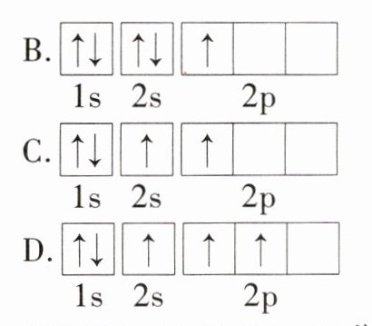 (1)![img id=2]为基态B⁺,结构稳定,能量低,再失去一个电子吸收能量多;![img id=3]为基态B,2p能级仅有1个电子,不稳定,易失去一个电子,吸收能量比基态B⁺少;![img id=4]为激发态B⁺,再失去一个电子吸收的能量比基态B⁺少;![img id=5]为激发态B,能量较高,失去一个电子吸收的能量比基态B少;综上,失去一个电子需要吸收能量最多的是A。