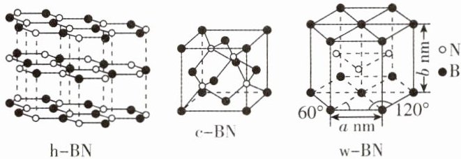 D. w-BN晶体的密度可表示为$\frac{3×11+3×14}{\frac{3\sqrt{3}}{2}a^{2}bN_{A}×10^{-21}}$ g·cm⁻³