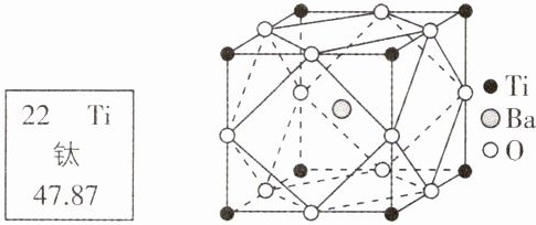 4. [河北石家庄二中2024月考]钛酸钡(BTO)是一种新型太阳能电池材料,其制备原理为BaCO₃+X$\stackrel{高温}{=\!=\!=}$BTO+CO₂↑。已知钛酸钡的晶胞(Ti⁴⁺、Ba²⁺均与O²⁻接触)和元素周期表中钛的数据如图所示,晶胞参数为a nm,Nₐ为阿伏加德罗常数的值。下列有关叙述正确的是 ( )