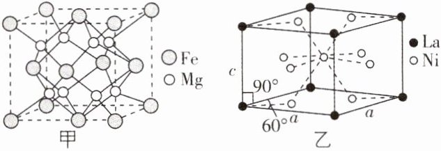 【解析】Mg为s区元素,A错误;根据均摊法,图乙晶胞中La个数为1,Ni个数为5,晶体化学式为$LaNi_5$,B错误;Fe位于顶点和面心,其个数:$8\times\frac{1}{8}+6\times\frac{1}{2}=4$,Mg位于晶胞内,个数为8,晶胞质量:$\frac{56\times4 + 24\times8}{N_A}g=\frac{416}{N_A}g$,晶胞体积:$(d\times10^{-10})^3cm^3$,则晶体密度:$\frac{416\times10^{30}}{N_Ad^3}g\cdot cm^{-3}$,C错误;该晶体储氢时,$H_2$分子在晶胞的体心和棱心位置,1个晶胞中含氢分子个数:$1 + 12\times\frac{1}{4}=4$,则储氢合金化学式:$Mg_2FeH_2$,含Mg 24 g(1 mol)的该储氢合金储存的$H_2$在标准状况下的体积约为11.2 L,D正确。