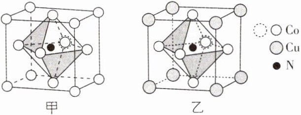 【解析】根据图甲可知,晶胞顶点和面心都是Co原子,所以共含有4个Co原子,体心含1个N原子,故化学式为$Co_4N$,A正确;$NO_3^-$中氮原子的杂化方式为$sp^2$,$NH_3$中氮原子的杂化方式为$sp^3$,所以$NO_3^-$键角大于$NH_3$,B错误;$Co_3CuN$晶体中,Co原子位于面心,若晶胞参数为a pm,最近的Co原子核间距为面对角线长的一半,即$\frac{\sqrt{2}}{2}a$ pm,C正确;$Co_3CuN$晶体中,Cu原子位于顶点,Co原子位于面心,Cu原子周围最近的Co原子有$3\times\frac{1}{2}\times8 = 12$个,D正确。