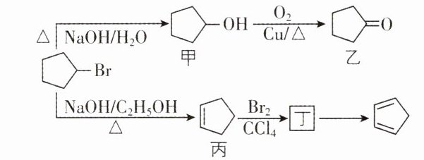 D 考查点:卤代烃的转化 【解析】一溴环戊烷在NaOH水溶液中发生取代反应生成甲,甲发生催化氧化生成乙,一溴环戊烷发生消去反应生成丙,丙与溴单质发生加成反应生成的丁为