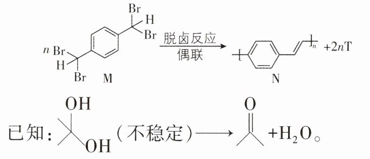 【解析】该反应由一种单体相互缩合生成高分子和小分子产物,属于缩聚反应,故A正确;N属于线型高分子材料,可以反复加热熔融,具有热塑性,故B正确;M中的碳溴键在碱性条件下完全水解,溴原子被醇羟基取代,已知连接在同一个碳上的2个羟基不稳定,所以能生成对苯二甲醛,故C正确;根据原子守恒可知,T的分子式为Br₂,应用NaOH溶液吸收,故D错误。