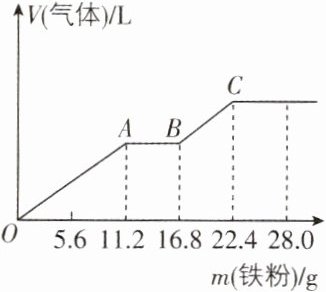 【解析】由分析可知,A正确;A点溶液中溶质为硫酸铁和硫酸,B错误;C点溶液中溶质为FeSO₄,此时消耗22.4g(即0.4mol)Fe,则n(FeSO₄)=n(Fe)=0.4mol,可知原混合酸中硫酸的物质的量为0.4mol,浓度为$\frac{0.4mol}{0.2L}$ = 2mol·L⁻¹,C正确;由A点消耗11.2g(即0.2mol)Fe可知,原混合酸中有0.2mol硝酸、0.4mol硫酸,NO₃⁻与SO₄²⁻的物质的量之比为1∶2,D错误。