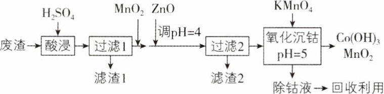 (1)问。加入MnO₂:MnO₂具有氧化性,在酸性条件下可将溶液中的Fe²⁺氧化为Fe³⁺,同时自身被还原为Mn²⁺,此时溶液中的金属离子主要是Co²⁺、Zn²⁺、Fe³⁺、Mn²⁺。加入ZnO调pH = 4、过滤2:根据题表中信息可知,调节溶液pH = 4时Fe³⁺沉淀完全,溶液中的金属离子主要是Co²⁺、Zn²⁺和Mn²⁺,“滤渣2”为Fe(OH)₃。氧化沉钴:加入强氧化剂KMnO₄,将溶液中Co²⁺氧化为Co³⁺,在pH = 5时Co³⁺形成Co(OH)₃沉淀,而KMnO₄则被还原为MnO₂;KMnO₄还会与溶液中的Mn²⁺发生归中反应,生成MnO₂沉淀。最终得到的“除钴液”中含有的金属离子主要是最初“酸浸”时与加入ZnO调pH时引入的Zn²⁺、加入KMnO₄“氧化沉钴”时引入的K⁺。\n**解析**:\n**